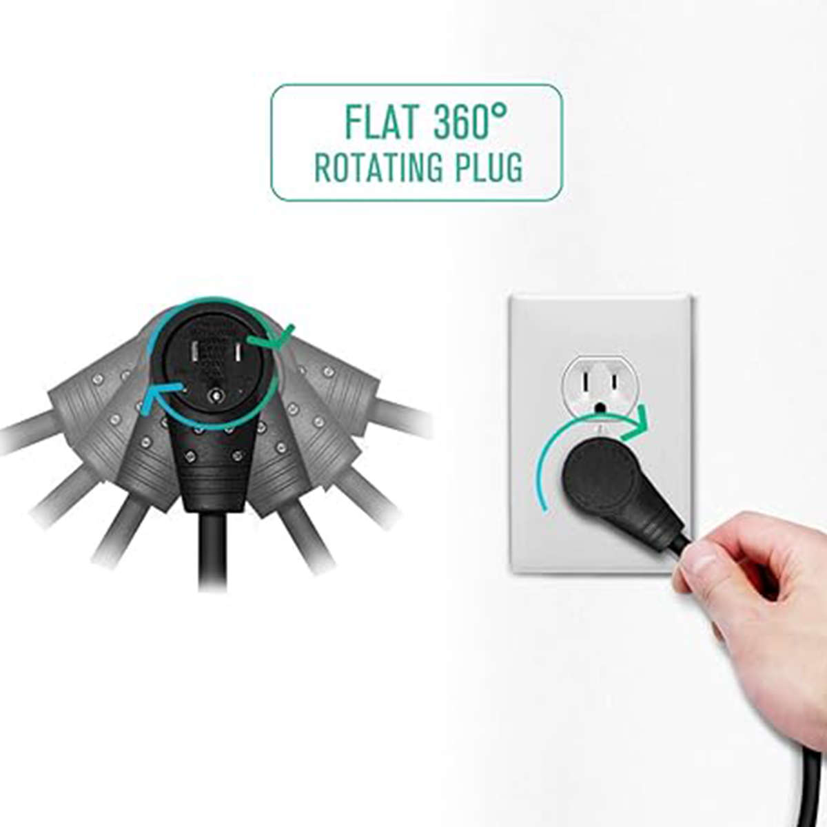 * Our 3 prong extension cord features a 360° rotating flat plug adapter that allows access to the outlet from any direction without unnecessary turning! You can easily push furniture against the wall without worrying about damaged plugs.